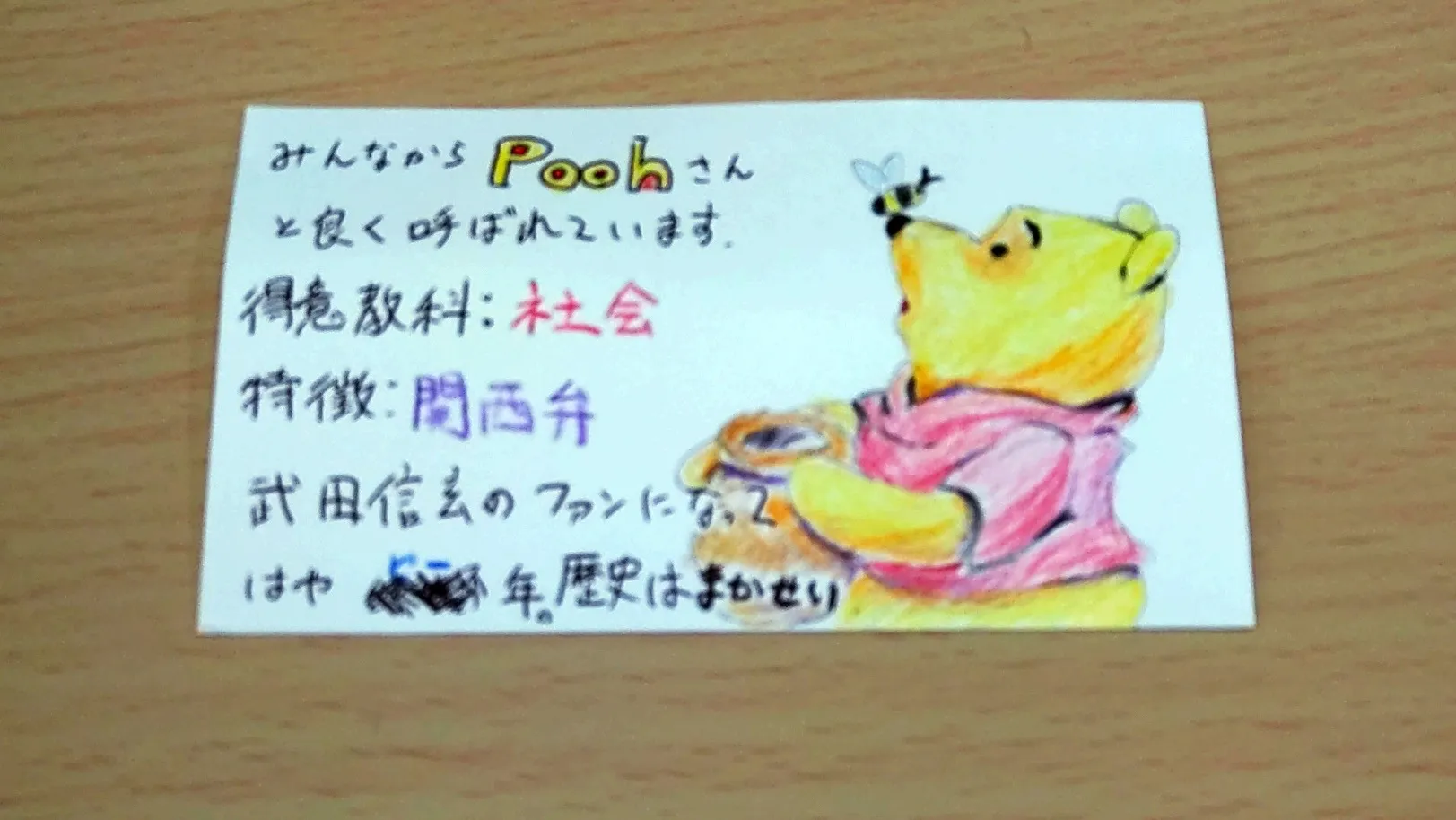 あだ名はプーさん。生徒からそう呼ばれることも良くありますし、私もOKしています。プーさんほどのんびり喋れない関西弁なので、聞き取れないときは「ゆっくりしゃべって」とどうぞおっしゃってください。