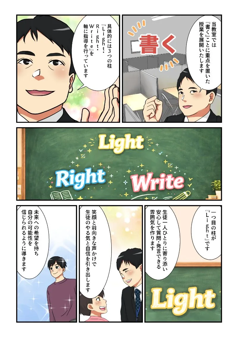 代表「具体的には、3つの柱『Light・Right・Write』を軸に指導を行っています」